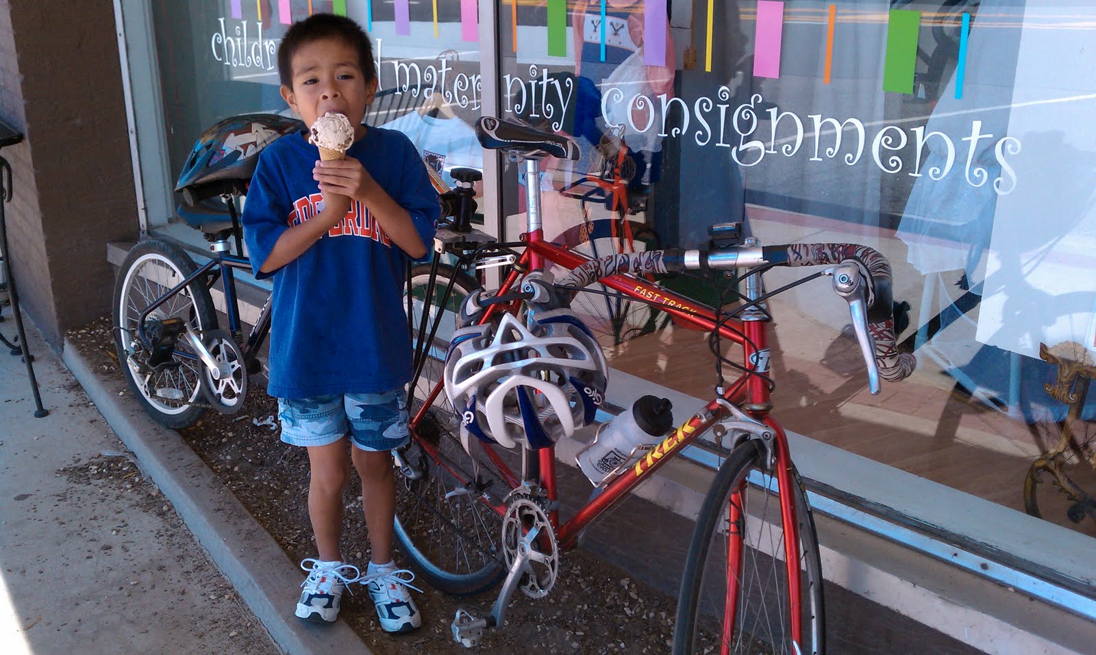 In the morning before going to work, Daddy when you get home will you play Star Wars with me? When I get home, before closing the door behind me, same question. He's really been wanting to go bike riding but usually ask immediately after I've returned from a 30 to 40 mile ride as I'm sprawled on the floor under the ceiling fan. Needless to say, due to the timing, I have to decline. So yesterday morning he asked and I immediately said yes, to which he lit up and added, can it just be you and me and not number 5 too? So off we went, just the two of us. E loves to discuss what he will do when he grows up, so we spend a lot of time talking about his grownup dreams, like having his own house he shares with his brother, being able to drive to the playground on his own, whenever he wants, and other "dreamy" ideas. He was sufficiently worn out after what was a fairly lengthy ride for him. It never hurts to take a pit stop for ice cream in the middle though to refuel.